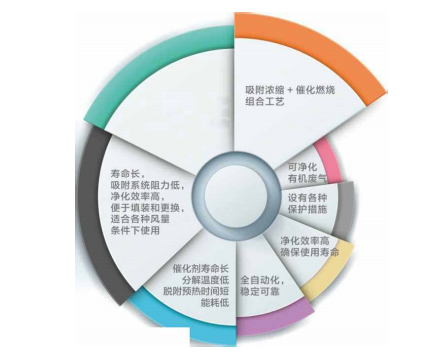 1、采用吸附濃縮 + 催化燃燒組合工藝,整個(gè)系統(tǒng)實(shí)現(xiàn)了有機(jī)物吸附、脫附過(guò) 程閉循環(huán)。